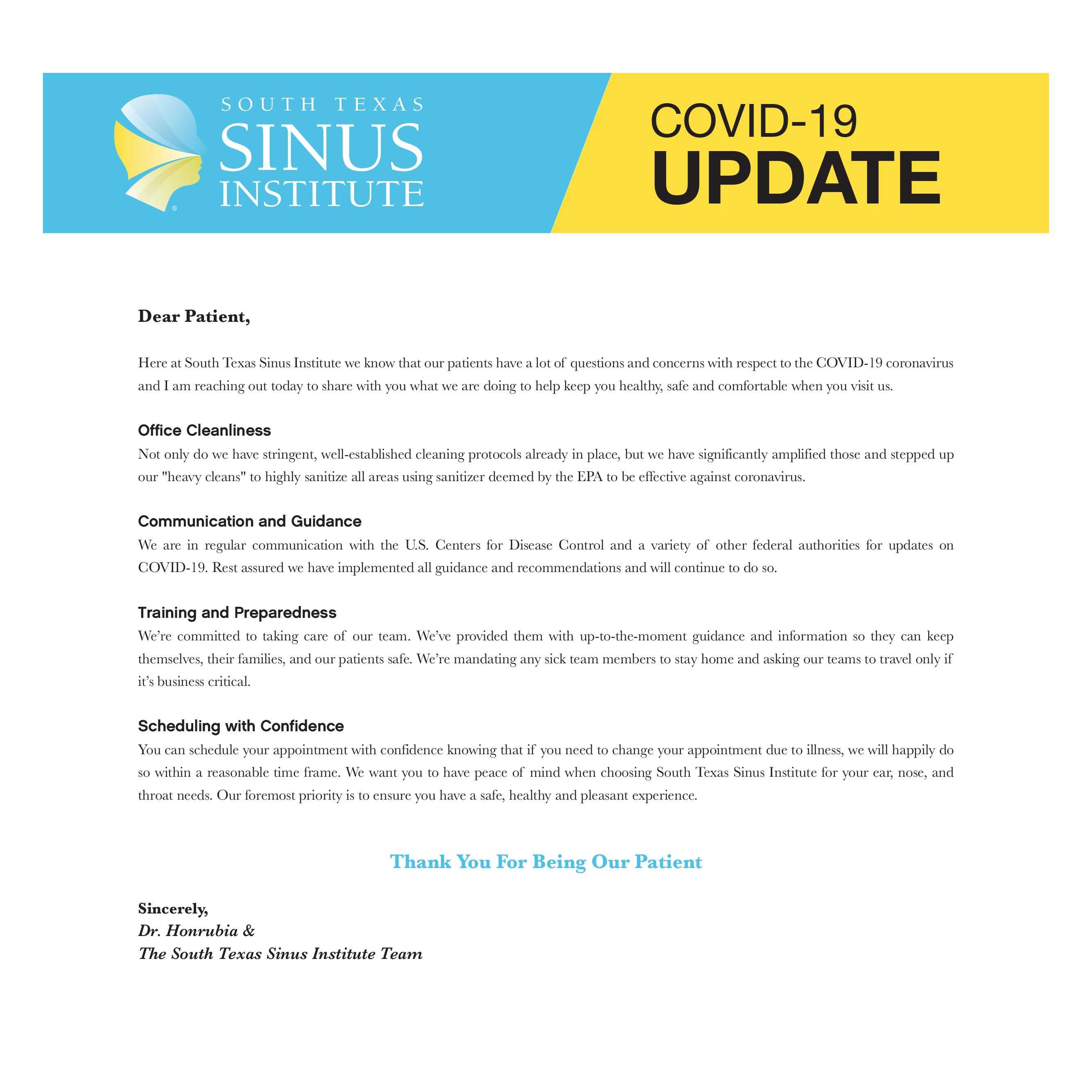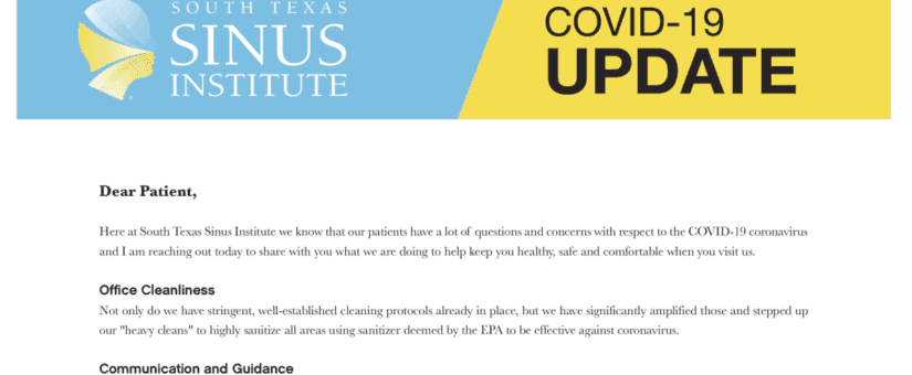 Here at South Texas Sinus Institute we know that our patients have a lot of questions and concerns with respect to the COVID-19 (coronavirus) and I am reaching out today to share with you what we are doing to help keep you healthy, safe and comfortable when you visit us.