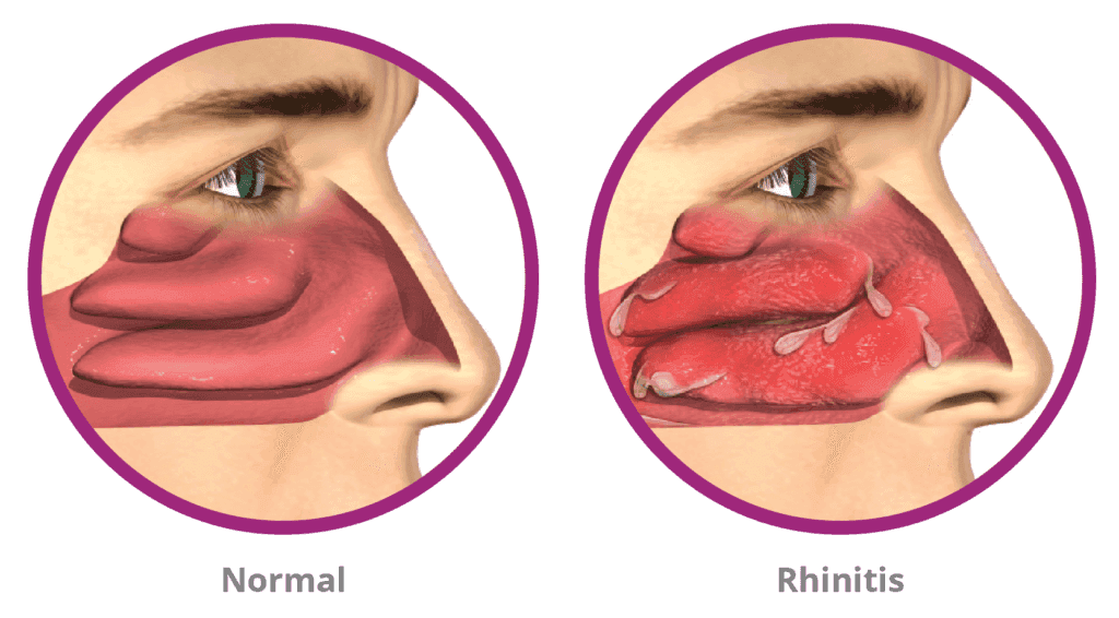 Rhinitis is inflammation and swelling of the mucous membrane of the nose. Rhinitis can be classified as allergic (“hay fever”) or non-allergic, and some patients may have both (referred to as “mixed”).